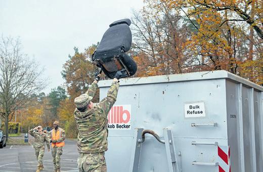 (Left) A U.S. Airman assigned to Ramstein Air Base loads a truck with garbage at Vogelweh Military Complex, Nov. 15. Several trash drop off locations and recycling centers were available to participants around the Kaiserslautern Military Community for the KMC Fall CleanUp Day.
