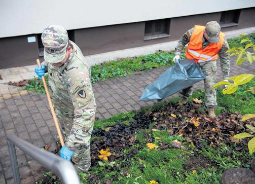 U.S. Army Command Sgt. Maj. Raymond Wrensch, U.S. Army Garrison RheinlandPfalz senior enlisted advisor, works alongside a U.S. Airman to clean the outside of base housing at Vogelweh Military Complex, Nov. 15. Kaiserslautern Military Community Fall Clean-Up Day was an opportunity to unite the community and build relationships while bettering the cleanliness of KMC installations.