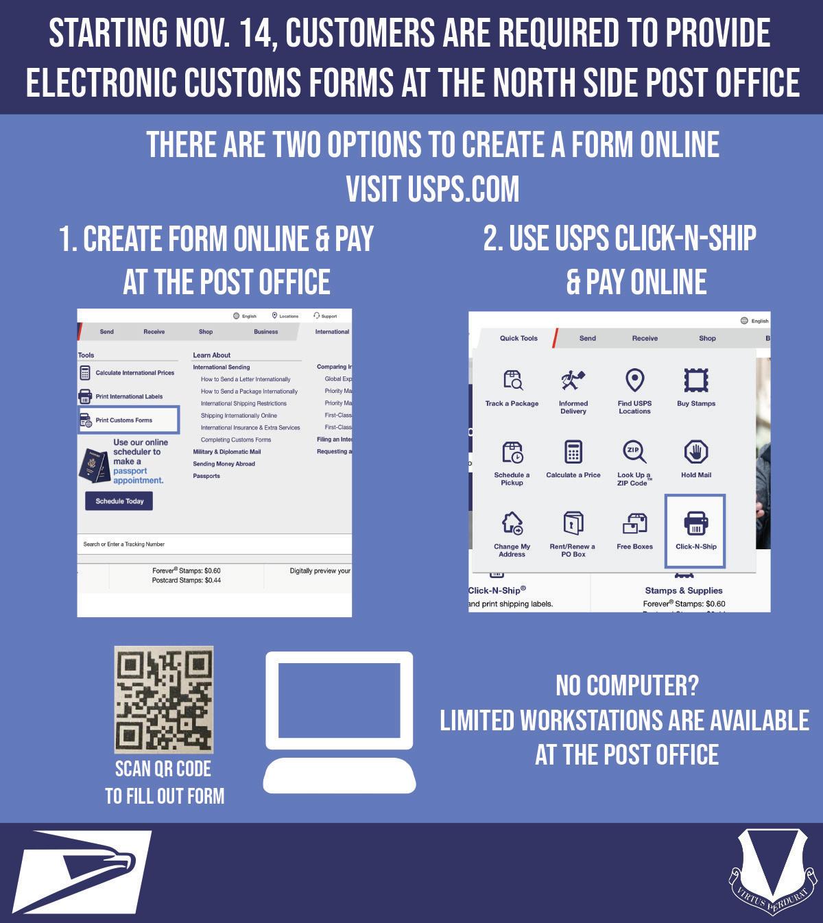 Customers will now be required to provide electronic customs forms in order to ship out packages at the Northside Post Office and Kapaun Post Office. This is a huge step forward to decrease customer wait time in the facility prior to the start of the holiday season. Customers can create the electronic customs forms by visiting www. usps.com. Customers can choose to either (1) print the electronic customs form from their home or (2) by creating and printing the electronic customs form at the stations located in each Post Office’s lobby. How-To instructions will also be provided at each station.