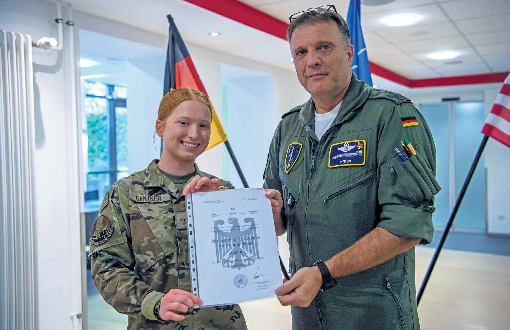 U.S. Air Force Airman Emma Gantner, 786th Force Support Squadron military postal clerk, receives a graduation certificate with German Air Forces Col. Michael Trautermann, German national senior representative of the NATO Headquarters Allied Air Command, at Ramstein Air Base, on Dec. 5. Gantner was the only woman to participate and received a badge in gold, obtaining the top overall score of A+++.