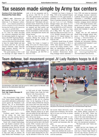 Story and photos by Tech. Sgt. Angelo Macugay III 3rd Air Force The Kaiserslautern High School Girls’ Junior Varsity basketball team successfully defended its unblemished record against the Wiesbaden Lady Warriors Jan. 20 at Kaiserslautern High School. The victory earned them their fourth straight win with a score of 20-14 and improving to 4-0 on the season. Freshman guard Jaelyn Salton led the charge, but stout team defense and crisp passing between the Lady Raiders were the keys to Kaiserslautern remaining undefeated. Faced with a height disadvantage, the Lady Raiders countered with an impenetrable zone defense, repelling Wiesbaden players from the rim and forcing the Lady Warriors to attempt tougher, long-range shots. Quick to help each other on defense, the Lady Raiders held Wiesbaden to just