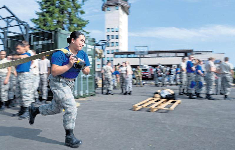 Civil Air Patrol Chief Master Sgt. Rachel Fullingim, Mildenhall Cadet Squadron cadet, runs with a hose at Ramstein Air Base, June 27. Firefighters assigned to the 86th Civil Engineer Squadron took CAP cadets through a series of exercises involving unraveling, folding and running with fire hoses, showcasing training needed to ensure readiness.