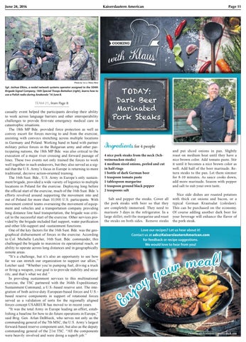 casualty event helped the participants develop their ability to work across language barriers and other interoperability challenges to provide first-rate emergency medical care in catastrophic situations. The 18th MP Bde. provided force protection as well as convoy escort for forces moving to and from the exercise, assisting with convoys stretching across multiple locations in Germany and Poland. Working hand in hand with partner military police forces in the Bulgarian army and other participating nations, the 18th MP Bde. was also critical to the execution of a major river crossing and forward passage of lines. These two events not only trained the forces to work well together in such endeavors, but they also served as a signal that the U.S. Army’s focus in Europe is returning to more traditional, decisive action-oriented training. The 16th Sust. Bde., U.S. Army in Europe’s only sustainment brigade, provided a wide variety of logistics to multiple locations in Poland for the exercise. Deploying long before the official start of the exercise, much of the 16th Sust. Bde.’s efforts revolved around supporting the movement into and out of Poland for more than 10,000 U.S. participants. With movement control teams overseeing the movement of equipment and vehicles and a transportation company providing long distance line haul transportation, the brigade was critical to the successful start of the exercise. Other services provided by the brigade included fuel support, water purification and other life-support and -sustainment functions. One of the key factors for the 16th Sust. Bde. was the geographical disbursement of forces in the exercise. According to Col. Michelle Letcher, 16th Sust. Bde. commander, this challenged the brigade to maximize its operational reach, or ability to operate across long distances and in geographically remote areas. “It’s a challenge, but it’s also an opportunity to see how far we can stretch our organization to support our allies,” Letcher said. “Whether you’re pumping fuel, driving a truck or firing a weapon, your goal is to provide stability and security, and that’s what we did.” In providing sustainment services to this multinational exercise, the TSC partnered with the 364th Expeditionary Sustainment Command, a U.S.-based reserve unit. The integration of both active-duty European-based forces and U.S.based reserve components in support of rotational forces served as a validation of sorts for the regionally aligned forces concept USAREUR has moved to in recent years. “It was the total Army in Europe leading an effort, establishing a baseline for how to do future operations in Europe,” said Brig. Gen. Arlan DeBlieck, who serves not only as the commanding general of the 7th MSC, the U.S. Army’s largest forward-based reserve component unit, but also as the deputy commanding general of the 21st TSC. “All the components were heavily involved and were doing a superb job.”