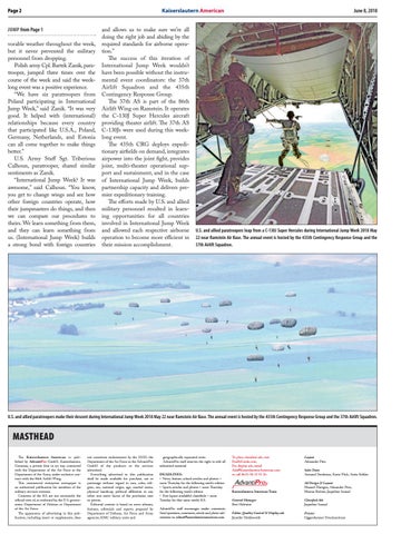 MASTHEAD The Kaiserslautern American is published by AdvantiPro GmbH, Kaiserslautern, Germany, a private firm in no way connected with the Department of the Air Force or the Department of the Army, under exclusive contract with the 86th Airlift Wing. This commercial enterprise newspaper is an authorized publication for members of the military services overseas. Contents of the KA are not necessarily the official view of, or endorsed by, the U.S. government, Department of Defense or Department of the Air Force. The appearance of advertising in this publication, including insert or supplements, does
