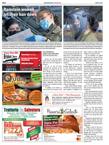 women have the same hair type, and our hair standards should reflect our diverse force,” said Chief Master Sgt. of the Air Force JoAnne S. Bass. “I am pleased we could make this important change for our women service members.” The changes are welcomed by Ramstein female Airmen as well, as 86th Maintenance Squadron women are happy to hear about the changes. “I had to cut my hair because I was having issues with it a year ago and now I can grow it back out again,” said Airman 1st Class Tsvyata Munguia, 86th MXS sheet metal aircraft structural maintainer. “So that makes me really happy.” Senior Airman Danielle Hundley, 86th MXS sheet metal aircraft structural maintainer, is delighted to see