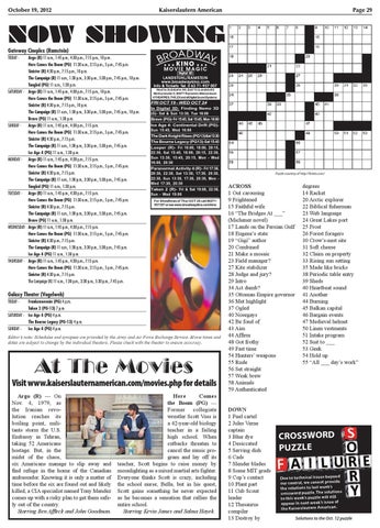 Visit www.kaiserslauternamerican.com/movies.php for details Argo (R) — On Nov. 4, 1979, as the Iranian revolution reaches its boiling point, militants storm the U.S. Embassy in Tehran, taking 52 Americans hostage. But, in the midst of the chaos, six Americans manage to slip away and find refuge in the home of the Canadian ambassador. Knowing it is only a matter of time before the six are found out and likely killed, a CIA specialist named Tony Mendez comes up with a risky plan to get them safely out of the country. Starring Ben Affleck and John Goodman.