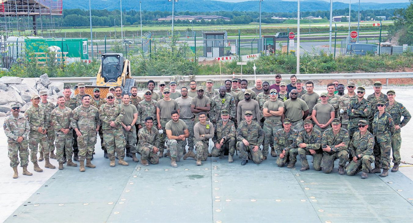 German air force members and U.S. Air Force Airmen assigned to the 86th Civil Engineer Group stand together after a two-day airfield repair demonstration at Ramstein Air Base, Aug 24. This demonstration was held with the intent to enhance interoperability, strengthen strategic partnerships, and improve the overall effectiveness of both the German air force and the 86th CEG airfield repair capabilities. Photo by Airman 1st Class Regan Spinner