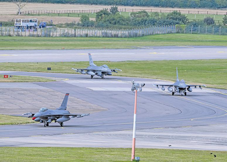 U.S. Air Force F-16CJ Fighting Falcon aircraft assigned to the 52nd Fighter Wing, Spangdahlem Air Base, arrive at Royal Air Force Mildenhall, England, to participate in the United Kingdom Royal Air Force-led Cobra Warrior 23-2 exercise, Aug. 29. The exercise offers training in air interdiction, dynamic targeting, offensive counter-air and defensive counter-air, suppression of enemy air defense and personnel recovery.