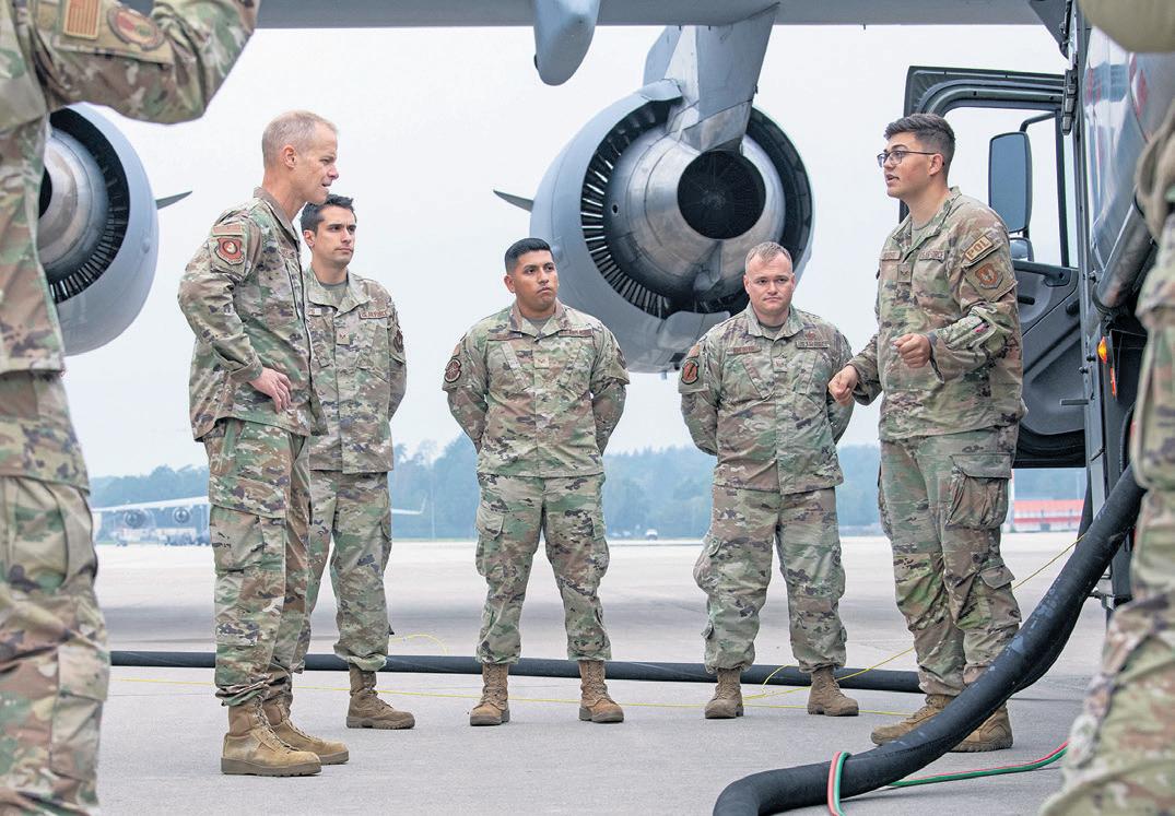 U.S. Air Force Airmen assigned to the 86th Logistics Readiness Squadron and 52nd Logistics Readiness Squadron, assigned to Spangdahlem Air Base, explain the new hybrid hydrant and how it will benefit Team Ramstein and the Air Force to Maj. Gen. Derek C. France, Third Air Force commander, at Ramstein Air Base, Aug. 30. The hybrid hydrant system can be used across a larger operational area and region, speeds up the aircraft fueling process, and is more cost effective than previous systems.