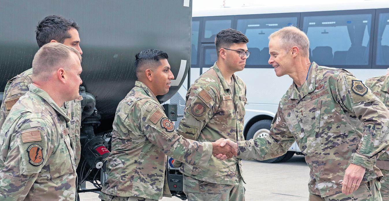U.S. Air Force Maj. Gen. Derek C. France, Third Air Force commander, coins Airmen assigned to the 86th Logistics Readiness Squadron and 52nd Logistics Readiness Squadron, assigned to Spangdahlem Air Base, at Ramstein Air Base, Aug. 30. Airmen from the 86th LRS and the 52nd LRS were recognized for developing specialized technology in order to carry out their duties safely and effectively.