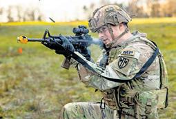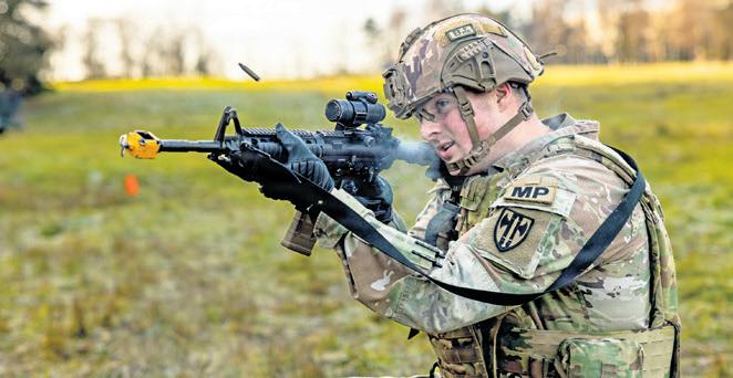 U.S. Army Pfc. Ian Glei, a military police officer assigned to the 554th Military Police Company, 709th Military Police Battalion, 18th Military Police Brigade, returns fire on the medical lane during the 709th Military Police Battalion Quarter Board Competition at U.S. Army Garrison Stuttgart, Dec. 1. The event assesses Soldiers on critical tasks and warrior skills in preparation for the upcoming 18th Military Police Brigade Best Squad Competition.