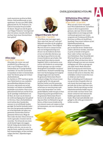 14 jun 1929 – 22 jul 2021 Miny was de vrouw van predikant Wim Eijkelenboom. Zij hebben samen in diverse gemeenten gestaan, zijn naar diverse landen uitgezonden en een lange periode Edgard Murwin Ferrol werkzaam geweest voor woon21 nov 1932 – 7 jul 2021 zorgcentrum Vredenoord (Wim als ‘k Zal Hem zien met eigen ogen, directeur en Miny als hoofd huisHeer mijn God, hoe zal ‘t mij zijn? houding). Daarnaast richtten zij het Bekende woorden uit de zangbunEijkelenboomfonds op. del Gezangen Sions. Toen Edgard Miny werd geboren in GroninMurwin Ferrol in contact kwam gen en had één broer. Omdat haar met ons kerkgenootschap was ouders adventist werden, ontstond dit een van de liederen die hem er grote armoede in het gezin. ervan verzekerden dat Jezus op Haar vader verloor zijn baan en werd kolenboer. Haar huwelijk met een dag terug zal keren om zijn Wim heeft haar op veel plaatsen trouwe kinderen op te halen. Die gebracht. Miny zei daarover dat ze hoop heeft hem daarna steeds altijd verheugd was met een nieuwe begeleid. Zelfs in zijn laatste uren uitdaging voor Wim en graag aan waren zijn kinderen en aanwezige zijn zijde stond. Mede daardoor familie getuige van zijn vasthoukeek zij terug op een mooi leven. dend geloof in de belofte van Jezus’ Samen kregen zij één zoon: Ton. Hij wederkomst. Hij heeft namelijk nog woont al vele jaren in Amerika. Het kort voor hij heenging overtuigend wekelijkse contact tussen hen was meegezongen met zijn familie. er altijd een met humor. De gemeente Rotterdam Noord Haar verbinding met Vredenoord verliest in Edgar Ferrol een trouw en gelovig lid. Als zijn gezondwas groot door de goede sfeer en heid het toeliet was hij aanwezig. vele mooie herinneringen aan de Hij deed vooral in de sabbatschool periode dat zij daar met haar man actief mee en nam de groep vaak werkte. Ook de oprichting van het mee in het bespreken van uitdaEijkelenboomfonds leidde nog tot gende Bijbelse onderwerpen en hun aan het einde van haar leven voor toepassing op het geestelijk leven. mooie contacten met mensen die De gemeente Rotterdam Noord hadden gestudeerd dankzij dit berust in de zekerheid, dat spoefonds. Miny had nadrukkelijk vastdig onze Heer en Heiland terug zal gelegd in alle stilte gecremeerd te keren, al Zijn trouwe kinderen bij willen worden. hun nieuwe naam zal roepen en hen zal meenemen, om voor eeuwig bij Hem te zijn.