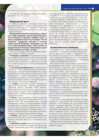 Божественные символы Виноградная лоза - один из самых ярких символов Библии: он отражает отношения между Богом и людьми. Виноградник является защищенным местом, где Бог (Виноградарь) нежно заботится о своих чадах - цветущих виноградных лозах. «Виноградник Господа Саваофа есть дом Израилев, и мужи Иуды - любимое насаждение Его» (Ис. 5:7). Виноградная лоза используется в качестве символа Церкви Божьей. Листья - это книги (религиозная литература); соцветия и плоды - члены Церкви; усики - евангельские программы; пасынки - молодежь и дети; почки - новые верующие. Соцветия, как правило, образуются в зоне второго-десятого междоузлий, а выше их до вершины побега развиваются усики. Малые церковные группы - из 2-10 человек - приносят прекрасные плоды, пребывая на лозе, несущей наши ветви. «Я есмь истинная виноградная лоза, а Отец Мой Виноградарь», - сказал Христос (Ин. 15:1). Виноград стал духовным символом возрождения Церкви, объединенной кровью Христа. Виноградная лоза была первым растением, посаженным Ноем после потопа, а в книге Исход - первым знаком того, что израильтяне достигли земли обетованной. Слова Христа: «Кто пребывает во Мне, и Я в нем, тот приносит много плода» (Ин. 15:5) являются обетованием, что Он наделит нас достаточной силой. Каждый верующий соединен со Христом, но не каждый пребывает в Нем с осознанной, радостной, уверенной самоотверженностью всего своего существа. Пребывать в Нем - это значит всей душой согласиться с тем, чтобы в наших каждодневных делах Он вел нас Своим Духом, чтобы мы полностью и безраздельно предоставили себя в Его распоряжение, дабы Он мог властвовать и действовать в нас. (Продолжение в следующем номере - «Миртовый плод, присутствующий в храме, является символом Церкви и семьи»).