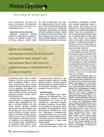 Жизнь Церкви В згляд в буду щ ее нечто необычайное, способное поразить воображение. Воспринимайте Писания такими, какие они есть» (Избранные вести, т. 1, с. 170). Практические наставления Принятие авторитета Библии включает в себя больше, чем просто верить, что Библия истинна. Слово Божье является точкой сопри-