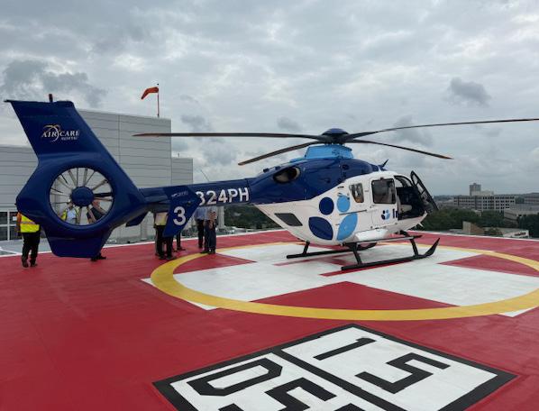 At 8 a.m. on Wednesday, Aug. 6, Shady Grove Medical Center rooftop helipad was opened for service. With careful coordination, crews removed barriers so that pilots could see the distinctive “H” marking the landing pad.