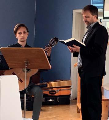 prædiken, og fællessangene havde musikledsagelse på guitarer og violin. Julian Gudmundsson glædede forsamlingen med en solosang akkompagneret af sønnen Daniel på guitar. Alle var glade for at kunne være tilbage i kirken igen.