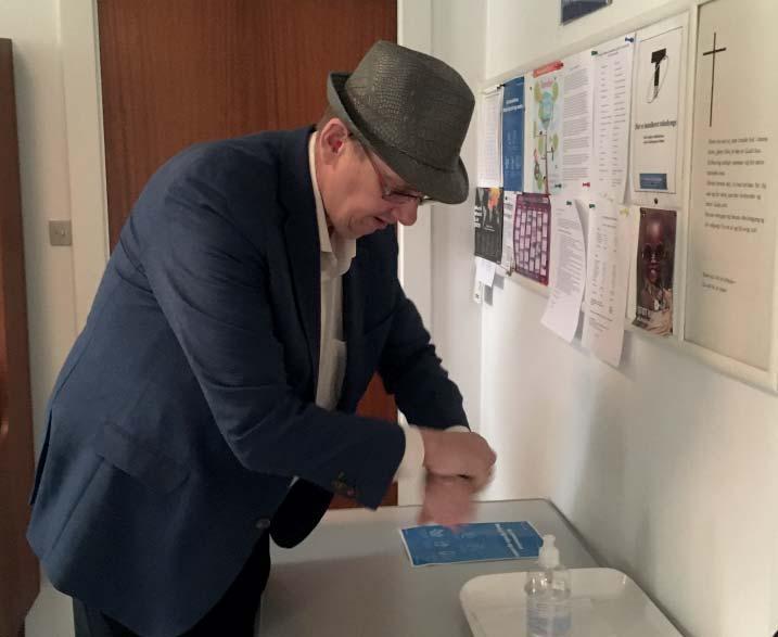 DET VAR TORSDAG den 7. maj og tid for offentliggørelse af statsministeriets planer for genåbningsfase 2. Vi sad opmærksomt derhjemme og fulgte med, og stor var overraskelsen, da det blev bekendtgjort, at folkekirken og øvrige trossamfund var en del af denne fase. Vi måtte genåbne fra den 18. maj. Vores præst, Thomas Rasmussen, indkaldte gudstjenestegruppen, musikergruppen samt besty relsen til et møde (hvor vi selvfølgelig holdt afstand), så vi kunne planlægge genåbningen på en tryg og kontrolleret måde. Vi afventede og modtog retningslinjer både fra kirkeministeriet og Adventistkirkens unionskontor. Dem tog vi med til mødet samt div. målebånd og tommestokke.