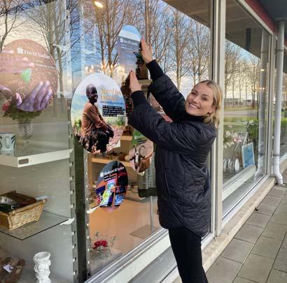 ADRA-medarbejder Laura Reiter Resenbro sætter her julens budskab op på forruden ved en af HappyHands butikker.