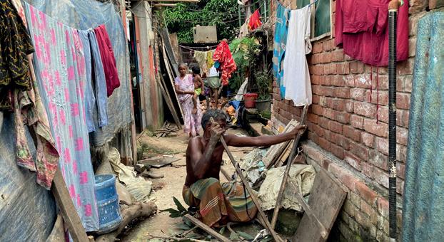 Vi kører mod Dhaka for at besøge en slumskole. Når vi nærmer os skolen forandrer området karakter. Asfaltvejen stopper og bliver til en mud ret vej, hvor blikskurene ligger tæt og gaderne bliver smalle. De mange affaldsbunker fanger igen vores blik, og sække af stofrester fra klæ defabrikker ligger og flyder. Slummens beboere leder efter de bedste og største stofrester, som de kan sælge og skabe en lille indtjening på.
