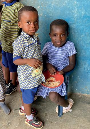 Skolen har rent vand, da de har deres egen vandboring. Til frokost tilbereder madmor Gertrude et varmt måltid mad til skolens elever.