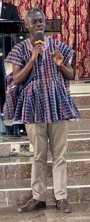 Som afslutning på formiddagens program bliver Kwaku bedt om at komme frem. Først modtager han forsamlingens gave på 500 GHC, i danske penge 300 kr., til Nana Deborah børnehjemmet.