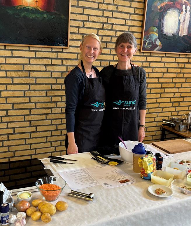 Kirken duftede af mad, og vidunderlige farver mødte øjnene, når man den 9. april kom ind i sidelokalet, hvor aftenens tema var sund mad. Sandy Flinker og undertegnede gav demo på seks opskrifter, som alle kan findes på sundogfri.dk . Sandy er ernæringsuddannet og har prøvet den slags mange gange. For mig var det første gang med det tema, og min erfaring er ellers bare fra mit eget køkken. Men det var sjovt, så jeg kan anbefale dig at hoppe ud i det – det møder i alt fald interesse fra folk i byen. Vi havde to uger forinden haft et foredrag med Sandy med titlen Sundhedsfordele