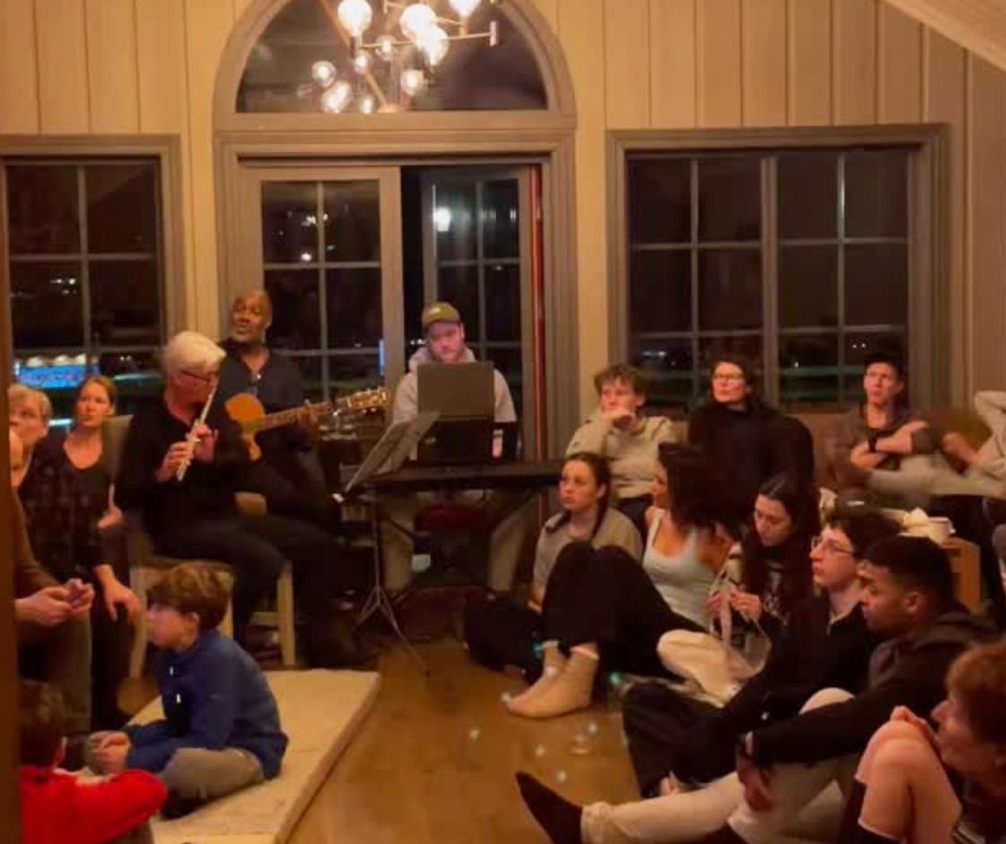 hjælp fra andre lokale kræfter – Freja og Kasper – og desuden tre dygtige musikere fra Sjælland: Catalina, Paula og Maté. Programmet bød bl.a. på flere meget smukke kvartetter, duetter og instrumentale numre spillet på guitar, valdhorn, trækbasun og violin. Og ikke at forglemme den fine lille børnesang, som Freja, Kasper og lille Lauge sang for os. Alt i alt et rigtig dejligt og opløftende program. Stor tak til de medvirkende.