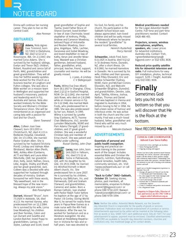 obituaries Adams, Nola Agnes (nee Timmins), born 10.7.1922 in Eketahuna, NZ; died 12.12.12 in Rossmoyne, WA. On 2.1.1947, she married Cyrus Adams. She is survived by her husband; siblings, Evelyn and Trevor (NZ); children, Robert, Rosalind and Janice (all of Perth, WA), grandchildren and great-grandchildren. They will all miss her faithful weekly updates. Nola worked for the Church as a business teacher at Longburn and Fulton colleges. She was also a Bible worker on a mission team in Wellington and supported her husband’s missionary, pastoral and leadership work in Fiji, Australia and Samoa. Nola also worked tirelessly for the Bible Society and Woman’s Christian Temperance Union. She will be remembered as an organised and caring lady with a passion for God and her Church. Glenn Townend Allen, Colleen Joan (nee Cleaver), born 19.5.1933 in Christchurch, NZ; died 4.1.13 in Redlands Hospital, Cleveland, Qld. On 17.1.1954, she married Pastor Graham Allen. She is survived by her husband (Victoria Point); Lindsay and Valmae Allen (Brisbane), Marilyn Allen (Perth, WA), Ashley Allen (Canberra, ACT) and Mark and Laura Allen (Montville, Qld); her grandchildren, Kelly, Jared, Nathan, Grace, Lillie, Angela, Shelby and Rhett; and her great-grandchild, Jack. Colleen was a devoted wife who supported her husband through decades of ministry. Graham honoured her with these words, “My sweetheart, rest in the blessed hope of the new morning. Always my pink vision.” Bob Possingham Durrant, Maxwell “Bruce”, born 7.5.1929 in Adelaide, SA; died 4.1.13. He married Vyrona, who predeceased him on 12.2.1984. He is survived by his wife, Lorna (nee Mowbray); his children and their families, Calvin and Lyn Durrant and Susette and Lyndon Butcher; loved Poppi to grandchildren, Larissa, Kristylee, Lashaye and Scott; loved