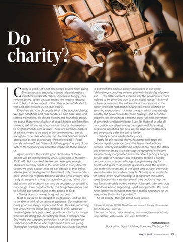 to entrench the obvious power imbalances in our world: “philanthropy combines genuine pity with the display of power and . . . the latter element explains why the powerful are more inclined to be generous than to grant social justice”.1 Many of us have experienced the awkwardness that can arise in the donor–recipient relationship. Giving can create unstated or assumed expectations. It can be a way in which the relatively wealthy and powerful can flex their privilege, and economic disparity can be styled as a societal good—all with the veneer of generosity and benevolence. Even for those of us who do not consider ourselves among the super-wealthy, making occasional donations can be a way to salve our consciences and perpetually defer the call to justice. • Charity is not a substitute for justice. Partly for the reasons above, no matter how large the donation—perhaps exacerbated the larger the donations become—charity can undermine justice. It can make the status quo seem necessary and side-step the questions why some are perennially marginalised and vulnerable. Feeding a hungry person today is necessary and important; feeding a hungry person—or a succession of hungry people—every day for months and years must prompt questions about the systems that make this necessary, at the same time as such generosity seems to make that system possible. “Charity is no substitute for justice. If we never challenge a social order that allows some to accumulate wealth—even if they decide to help the less fortunate—while others are short-changed, then even acts of kindness end up supporting unjust arrangements. We must never ignore the injustices that make charity necessary, or the inequalities that make it possible.”2 So do charity—then get about doing justice. 1. Reinhold Niebuhr (1932), Moral Man and Immoral Society, Westminster John Knox, 2021, page 127. 2. Michael Eric Dyson, “Voice of the Day,” Sojourners, December 9, 2019, <sojo.net/daily-wisdom/verse-and-voice-12092019>.