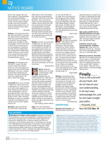 NOTICE BOARD Karen, Deb, Haydee, Roni and their husbands; 10 grandchildren and 11 great-grandchildren. Gordon worked as a builder and courier and was always willing to help in any way he could to improve other people’s lives. He loved his family and had a keen sense of humour. Bob Bolst Kirkman, June Audrey (nee Morley), born 23.9.1925 in St Arnaud, Vic; died 24.8.16 in Suffolk Park, NSW. She married Wray Kirkman on 19.8.1947. She was predeceased by her husband in 2012 and daughter Jennifer Anne Ryan in 2010. She is survived by her son and daughter-in-law Barry and Clare Kirkman (Mullumbimby); and grandson Hayden (Newcastle). June was a much-loved mum and will be dearly missed by her family and members of the Mullumbimby church. Cranville Tooley Kozlowski, Ivan Raphael, born 29.9.1925 in Loxton, SA; died 17.6.16 in AdventCare Whitehorse, Vic. He is survived by his nephew Colin (and Julie) Dunstan (Rochester). Ivan was a resident of AdventCare Whitehorse for 38 years. He enjoyed playing the violin and singing hymns. His faith in Jesus was strong. Lindy Sperring