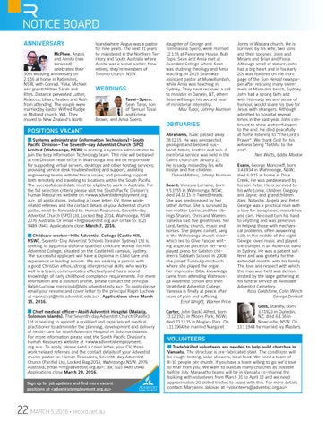 OBITUARIES Abrahams, Isaac passed away 28.12.15. He was a respected geologist and beloved husband, father, brother and son. A memorial service was held in the Cairns church on January 21. He is sadly missed by his wife Roslyn and five children. Daniel Matteo, Johnny Murison Beard, Vanessa Lorraine, born 9.5.1955 in Wahroonga, NSW; died 24.12.15 in Tweed Heads. She was predeceased by her father Arthur. She is survived by her mother Lorrie; and her siblings Sharon, Chris and Warren. Vanessa had five great loves: her Lord, family, church, music and horses. She played cornet, sang in the Wahroonga church choir— which led to Clive Pascoe writing a special piece for her—and played piano for Galston children’s Sabbath School. In 2008 she joined Tumbulgum church where she played the organ. Her impressive Bible knowledge came from attending Wahroonga Adventist School and then Strathfield Adventist College. Vanessa is finally at peace after years of pain and suffering. Errol Wright, Warren Price Carter, John (Jack) Alfred, born 13.12.1921 in Moore Park, NSW; died 23.12.15 in Niagara Park. On 1.11.1964 he married Margaret