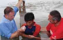 One of the people baptised included an orphaned boy from Bodh Gaya’s Aozora School (pictured during baptism with Pastor Watts and Dr Matthes, below left). The school serves as an orphanage and a number of students live there. There were also 160 people who made the decision to accept Jesus into their lives.