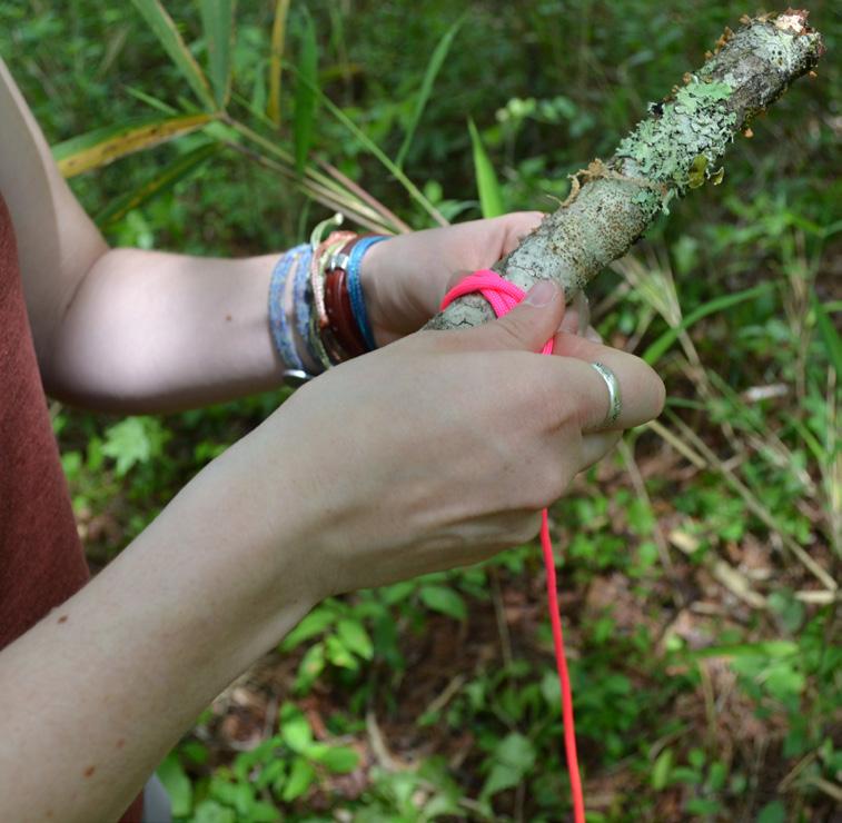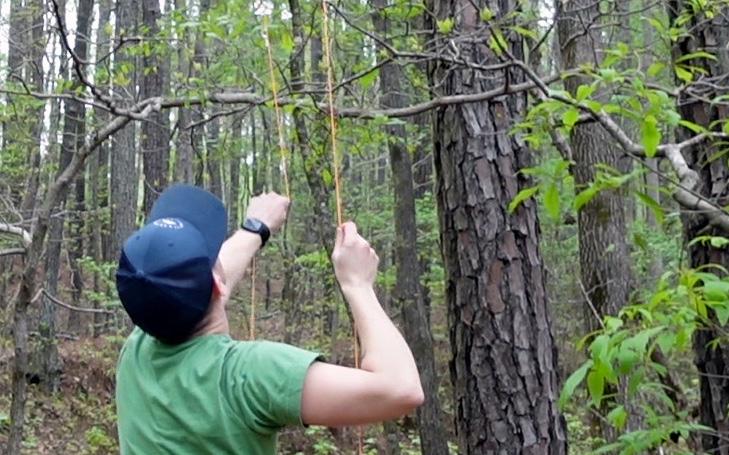 Tie one end of the cord to something small and heavy that you can toss: a rock, hefty stick, or a water bottle work well.
