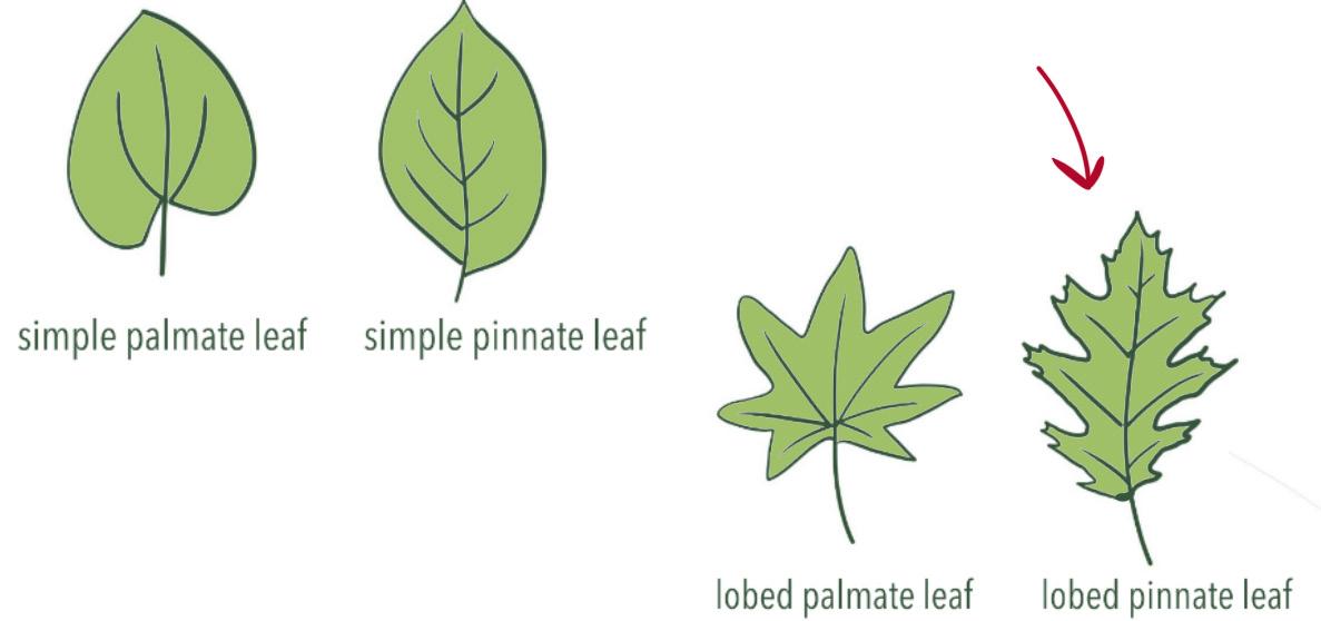 Look at the leaf veins to see if the leaf is pinnate or palmate. Palmate leaves have veins originating from a single point. Pinnate leaves have veins that branch off a central vein.