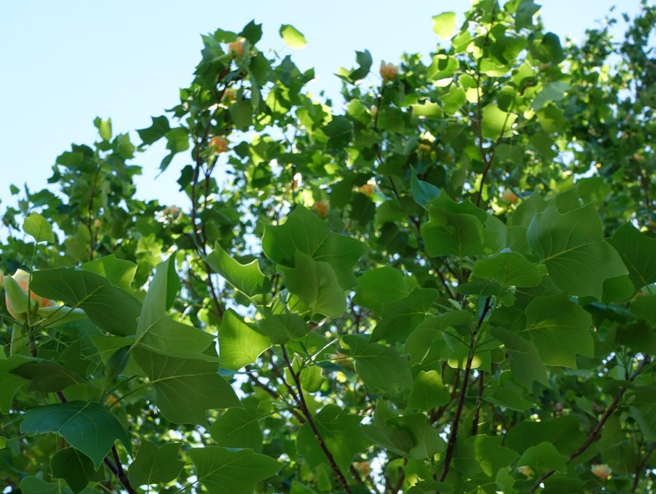 Large, distinctive leaves can be spotted from below if you look up. In late spring to early summer, the trees have yellow-orange flowers