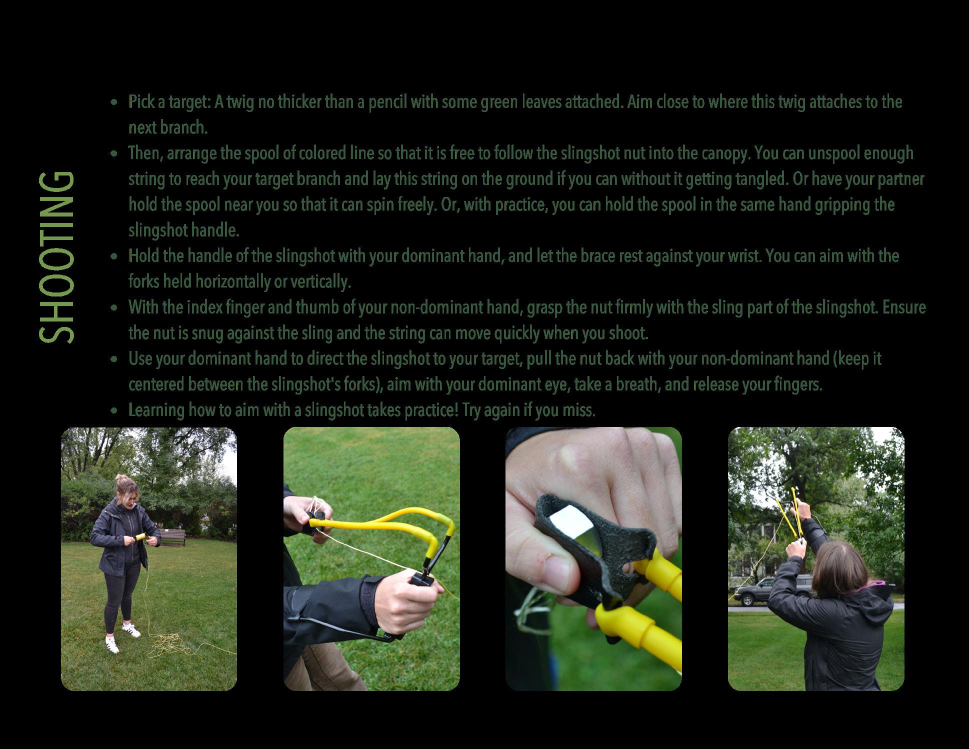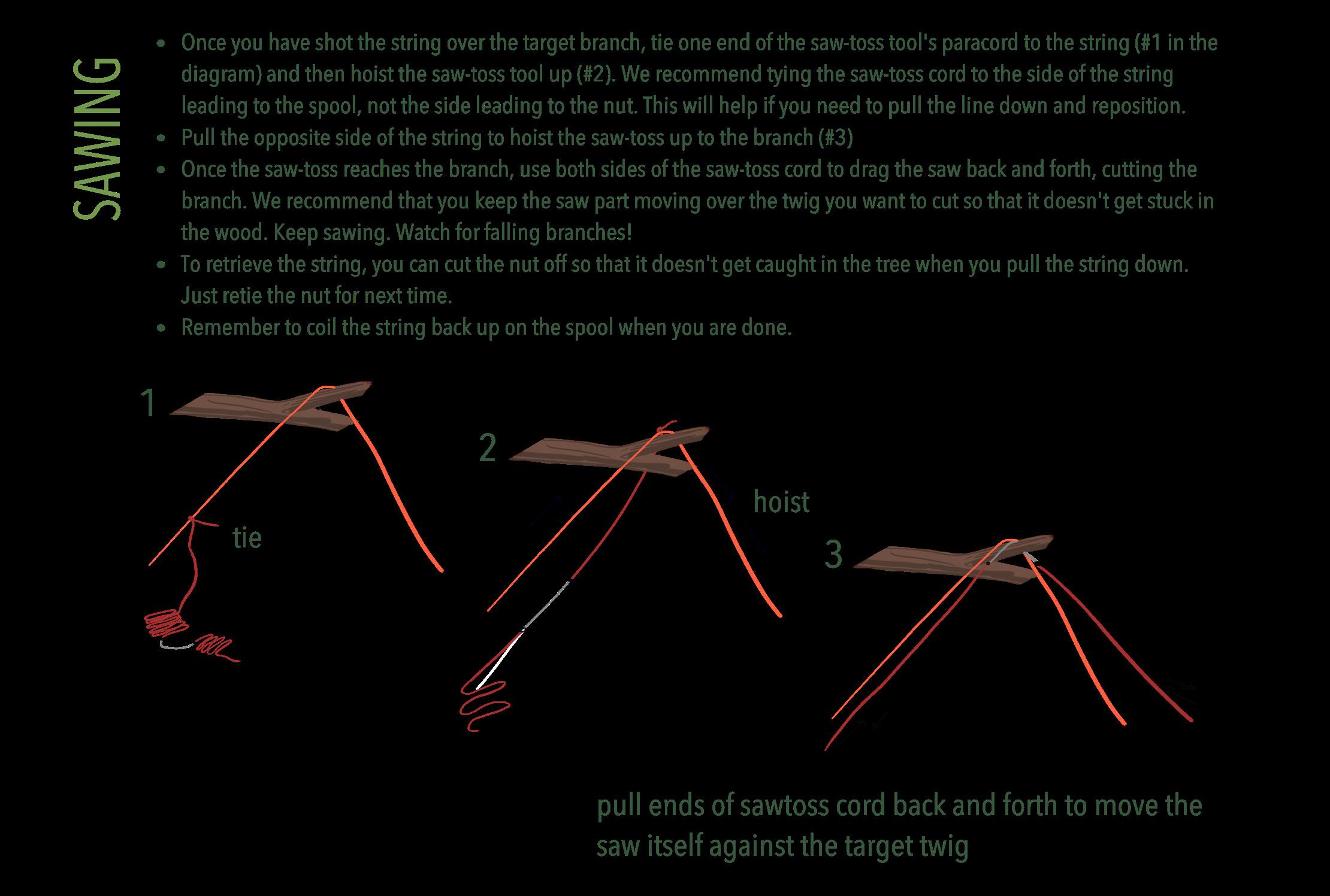 If the only branches are higher than 30 feet (or the distance you can toss up) use the slingshot and saw-toss. See instructions for the slingshot p13-14 and saw-toss p11-12 .