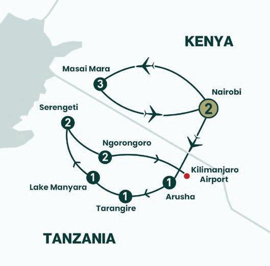 > Safaris in six iconic national parks throughout Kenya and Tanzania.