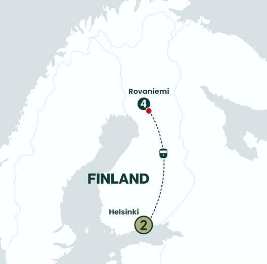 Includes 2-nights accommodation, 4-nights Aurora Cabin accommodation, train between Helsinki-Rovaniemi, private transfers, 12 meals, guided sightseeing and a selection of handpicked experiences.