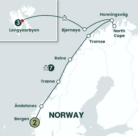 Depart from Bergen, ‘The City of Seven Mountains’ and explore the city on a private tour taking in modern landmarks, historic buildings and visit the Bryggen Wharf, a UNESCO World Heritage site. Board your cruise on day three, leaving the colourful seafront of Bergen behind for the Norwegian Sea and coastal towns like Åndalsnes and Træna. Over the course of the next week, sail beneath the glow of the Midnight Sun, explore Longyearbyen – the last town before the North Pole - and scan the shorelines for polar bears.