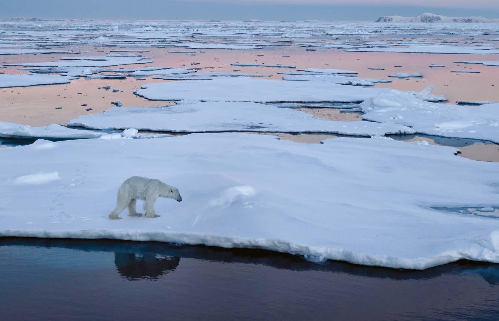> Scan the Arctic shoreline for polar bears as they roam their icy