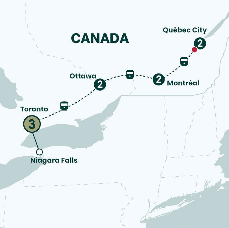 Includes 9-nights accommodation, VIA Rail trains between Toronto-OttawaMontréal-Québec City, transfers, 5 meals, sightseeing and a selection of handpicked experiences.