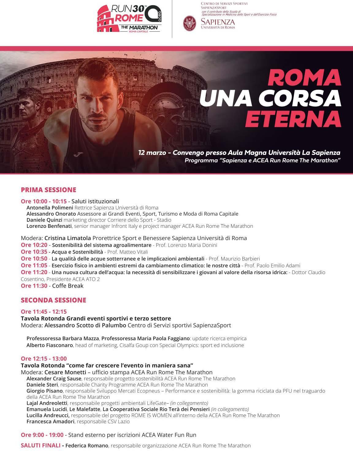 Questa è la 30^ Acea Run Rome The Marathon, un evento sportivo che non ha mai avuto eguali. Abbiamo alzato l’asticella, pensando e sognando in grande per questa Acea Run Rome The Marathon che compie trent’anni: abbiamo invitato tutti i maratoneti del mondo a correre e a conoscere Roma, la città più bella del mondo. I nostri non sono normali runner, sono Gladiatori moderni che corrono nella storia, indomiti, forti, instancabili. Solo a Roma un runner è un vero gladiatore. Sabato 15 e domenica 16 marzo sarete oltre 50mila in due giorni di eventi, con la Acea Water Fun Run anticipata al sabato mattina così come accade nelle più grandi maratone del mondo. Così tutti, anche i maratoneti possono partecipare e divertirsi insieme ai loro familiari. E poi domenica sarà un’esplosione totale di gioia, adrenalina pura per chi come noi ama la corsa e tutte quelle fantastiche sensazioni che ne derivano. Ancora una volta abbiamo portato Roma nel mondo con l’organizzazione dei Get Ready On Tour che vanno a sommarsi ai 6 Get Ready ufficiali di Roma, ormai talmente partecipati che sembrano vere gare. Poi l’Expo Village che sarà ancora più bello e aperto un giorno in più, così come grande festa con musica, giochi e tanto altro sarà per due giorni consecutivi al Circo Massimo dove quest’anno per la prima volta nella storia arriverà la maratona. Trent’anni si compiono una volta sola e abbiamo organizzato una gran bella festa di compleanno con migliaia di invitati che arrivano da ben 126 nazioni. Correte, divertitevi, Roma è pronta ad accogliervi e ad abbracciarvi, come sempre e più di sempre Acea Run Rome The Marathon siete voi!