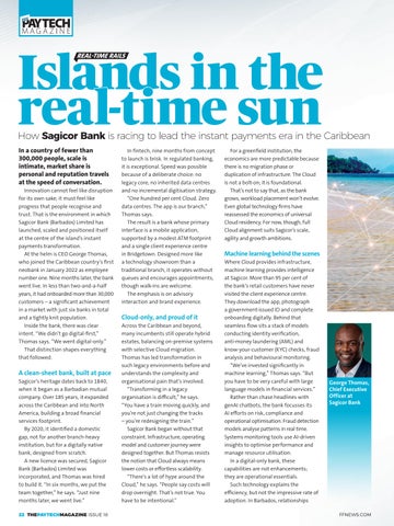 A clean-sheet bank, built at pace Sagicor’s heritage dates back to 1840, when it began as a Barbadian mutual company. Over 185 years, it expanded across the Caribbean and into North America, building a broad financial services footprint. By 2020, it identified a domestic gap, not for another branch-heavy institution, but for a digitally native bank, designed from scratch. A new licence was secured, Sagicor Bank (Barbados) Limited was incorporated, and Thomas was hired to build it. “In six months, we put the team together,” he says. “Just nine months later, we went live.” 22 THEPAYTECHMAGAZINE ISSUE 18