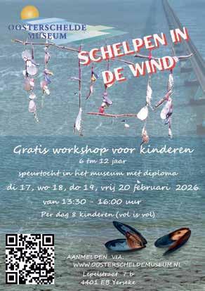 • Yerseke, 17 t/m 20 februari – Kinderworkshops Gratis workshop Schelpen in de Wind voor kinderen 6 t/m 12 jaar. Maak je eigen windmobile en doe mee met een speurtocht in het museum met diploma na afloop. Van 17 t/m 20 februari 2026 in het OosterscheldeMuseum Yerseke.