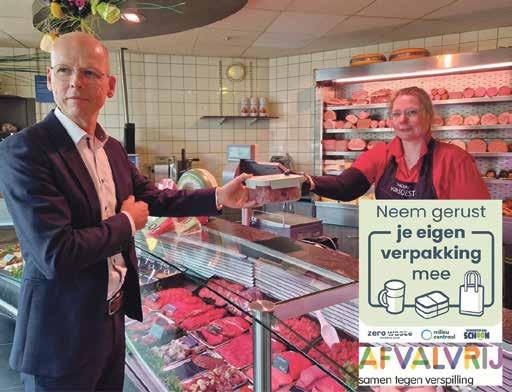 Wethouder Maarten Both plakte woensdag 22 mei een raamsticker bij slagerij Van Soest: ‘Neem gerust je eigen verpakking mee’. Zo zien klanten dat ze met eigen bakjes en zakjes boodschappen kunnen komen doen en minder verpakkingsmateriaal verbruiken.