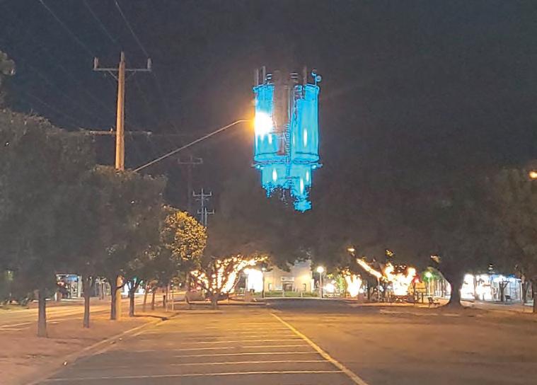 LIT UP IN BLUE... A national campaign to draw attention to lymphoedema during the month of March will see over 60 landmarks across Australia lit up in blue, including a tree in Monash Park and this Mooroopna water tower. Photo: Supplied