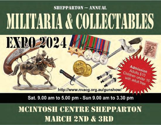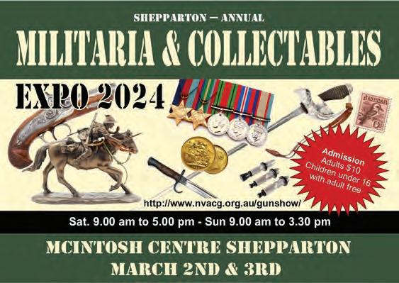 SOLD SOLD SOLD SOLD SOLD SOLD E: info@links8.com.au www.links8.com.au BRAND NEW LAND SUBDIVISION Call exclusive selling agent 0437 794 049 What we can do: •Finance •Architect •Builders •Accountants •Lawyer/conveyancer •Anything to do with purchasing your block or building your home Big blocks compared to Melbourne and prices you can afford. Large blocks of 520m to 900m with multiple choices of builds. Includes builders such as Metricon, Sherridon Homes, Dual Key Victoria, ABC Homes, Simonds Homes or chose your own local builder. If you want to subdivide your block, build your family home, build an investment property or multi-unit/townhouse site, please contact us today to get the best block for you. Blocks priced from $220,000 SCAN HERE Added bonus NO time restrictions to build. TO START IN 60B MORRISSEY ST, MERRIGUM 3618 CALL TODAY Several Blocks Under Contract SHEPPARTON ANNUAL MILITARIA & COLLECTABLES & 3RD Adults $10 Under 16s FREE with paying adult McIntosh Centre Sat 9-5pm | Sun 9-3:30pm
