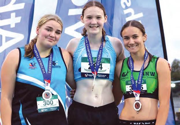 PODIUM CELEBRATIONS… Alice Ludlow (left) from Shepparton stands tall on the podium after securing a silver medal in the U17 shot put. Pictured with her are Jazmin Firth (middle) and Milan Keogh (right). Photo: Supplied