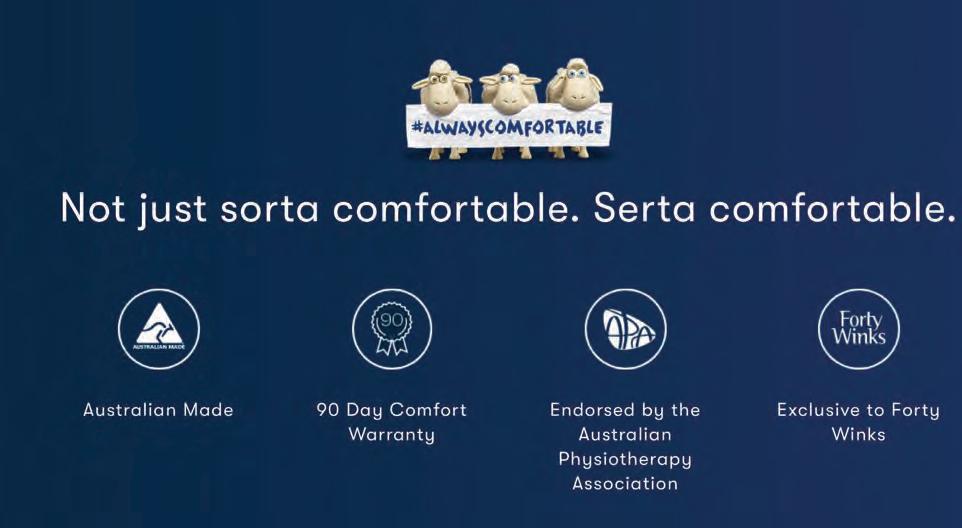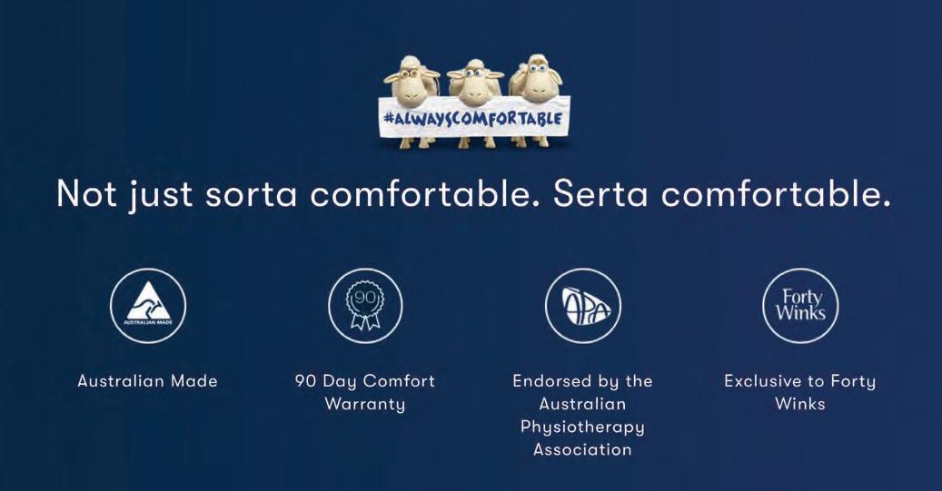 Page 32 – The Adviser Australia No.1:1702 Wednesday, February 28, 2024 Products and savings will vary from store to store. While stocks last. Exclusions apply. At participating stores only. Shepparton Riverside Plaza 8025 Goulburn Valley Hwy, Kialla Phone: 03 5821 0955 shepparton@fortywinks.com.au fortywinks.com.au SUPER Manager’s s special l prices • • 11 1 Different t comforts • Must t see e in-store Queen Mattress s from $1999 King Mattress s from $2499 S A L E Exclusive to Forty Winks Not just sorta comfortable. Serta comfortable. KulKote Temperature regulating layer 10 Year guarantee 10