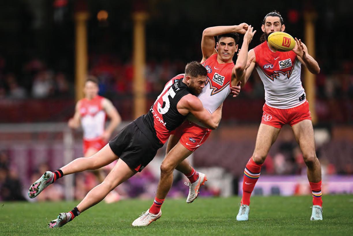 Brodie Grundy of the Swans (right) put on arguably the best ruckman’s performance of the season during the AFL Round 21 match between the Sydney Swans and the Essendon Bombers at the SCG. Photo: BIANCA DE MARCHI/AAP IMAGE